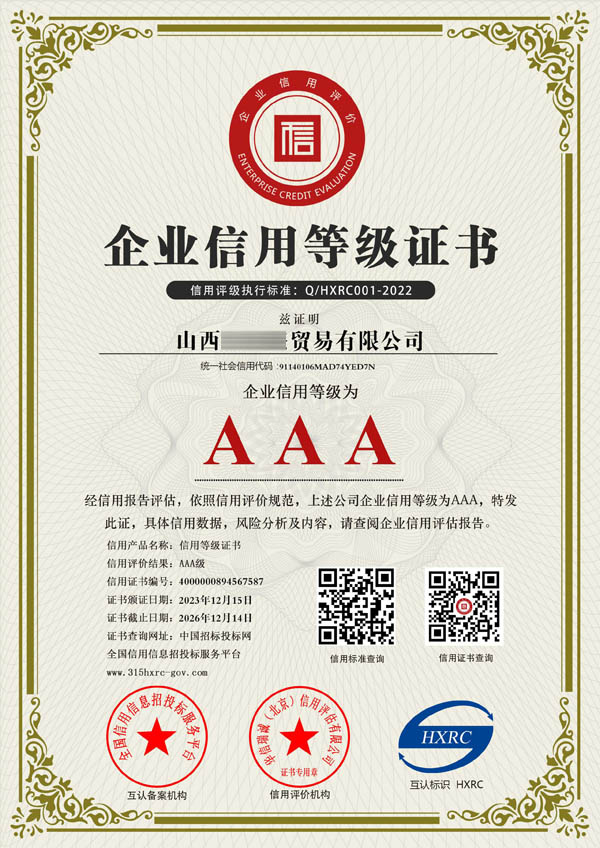 山西AAA企業信用評級網是從事企業認證咨詢、各行業榮譽證書辦理的網站,認證主要包含企業AAA信用等級證書、ISO體系認證、服務認證等認證產品。出證快、價格優。 企業AAA信用等級證書主要包含:AAA企業信用等級、AAA企業資信等級、AAA重合同守信用、AAA質量服務誠信企業、AAA誠信經營示范單位、誠信企業家、誠信經理人、AAA重質量守信用、AAA重服務守信用、AAA誠信供應商等。我們將一如既往繼續努力,能夠和您合作是我們的榮幸!山西AAA企業信用評級網本著“誠信、專業、優質、高效”的宗旨為廣大客戶提供全方位的認證咨詢服務,本公司愿與廣大的新老客戶真誠合作、攜手共進! >> 更多內容 |